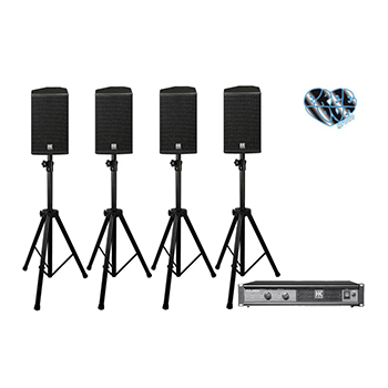4no. HK Audio CT108 speakers, 4no. speaker stands, amplifier and cables